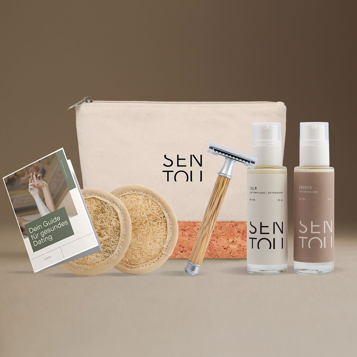 - Enthalten: SMOOTH (Peeling), CALM (Aftershave), SHARP (Sicherheitsrasierer), Scrub Pads, Kosmetiktasche (Canvas + Kork, EU-Produktion), CONNECT Dating-Guide, Premiumversion (PDF)