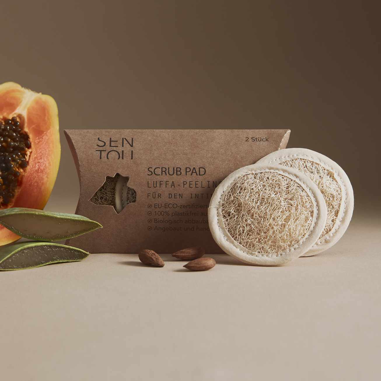 Sanft, natürlich und plastikfrei: Unsere SCRUB Pads bestehen aus natürlicher Luffa-Gurke, eingefasst mit einem Baumwollband und praktischer Handschlaufe - handgefertigt in Spanien aus EU-ECO-zertifizierter Herstellung. Die pflanzliche Faser sorgt für ein sanftes, aber wirkungsvolles Peeling und unterstützt die natürliche Hauterneuerung, ideal für die empfindliche Haut im Intimbereich. 100 % aus Naturmaterialien, vollständig plastikfrei, biologisch abbaubar und kompostierbar - für eine bewusste, nachhaltige Pflegeroutine ohne Kompromisse.